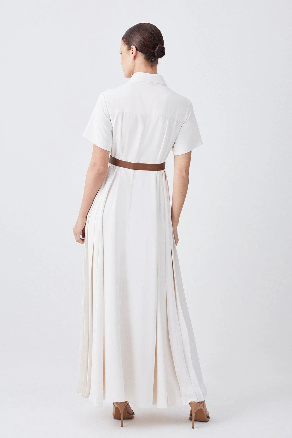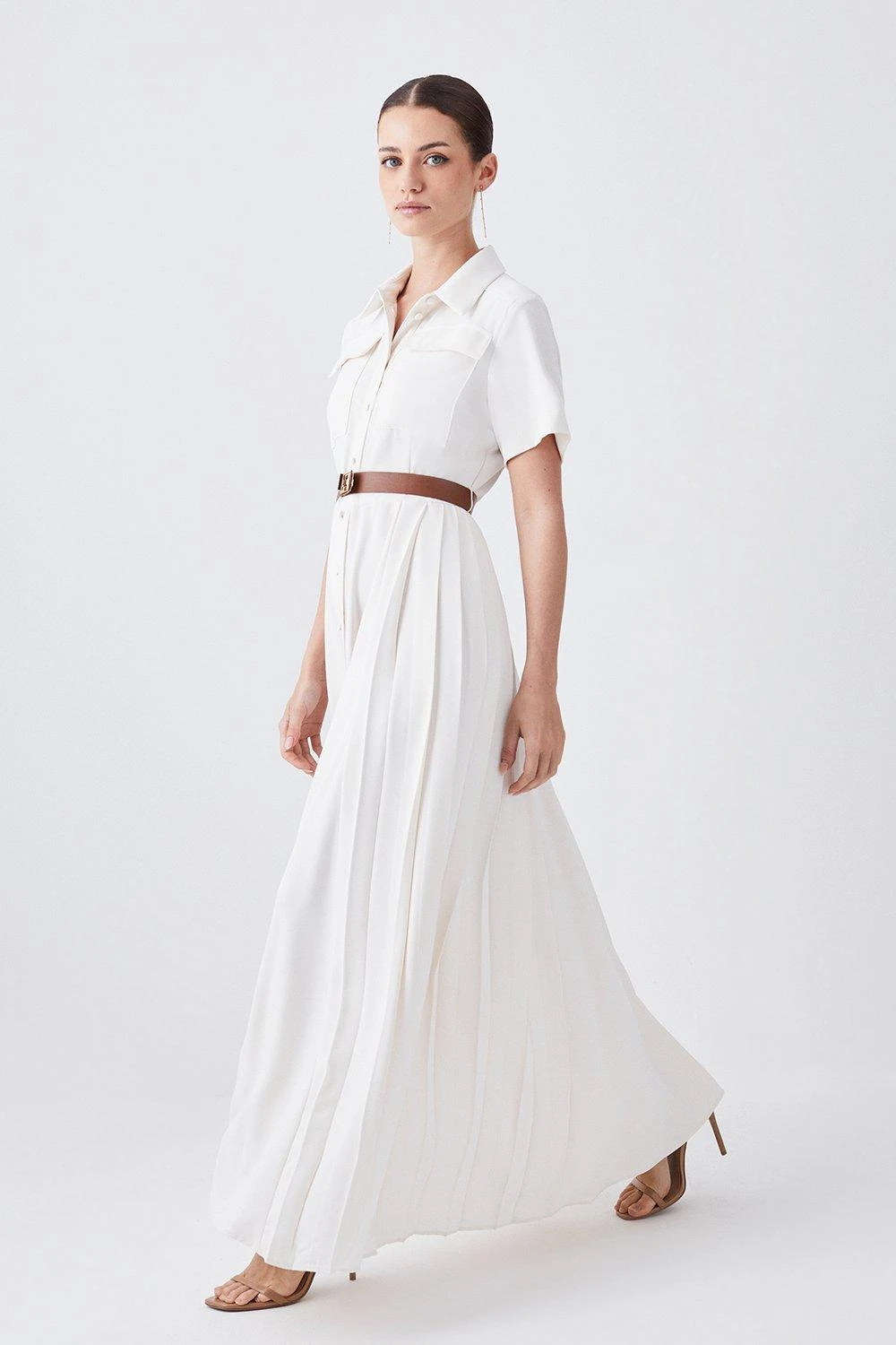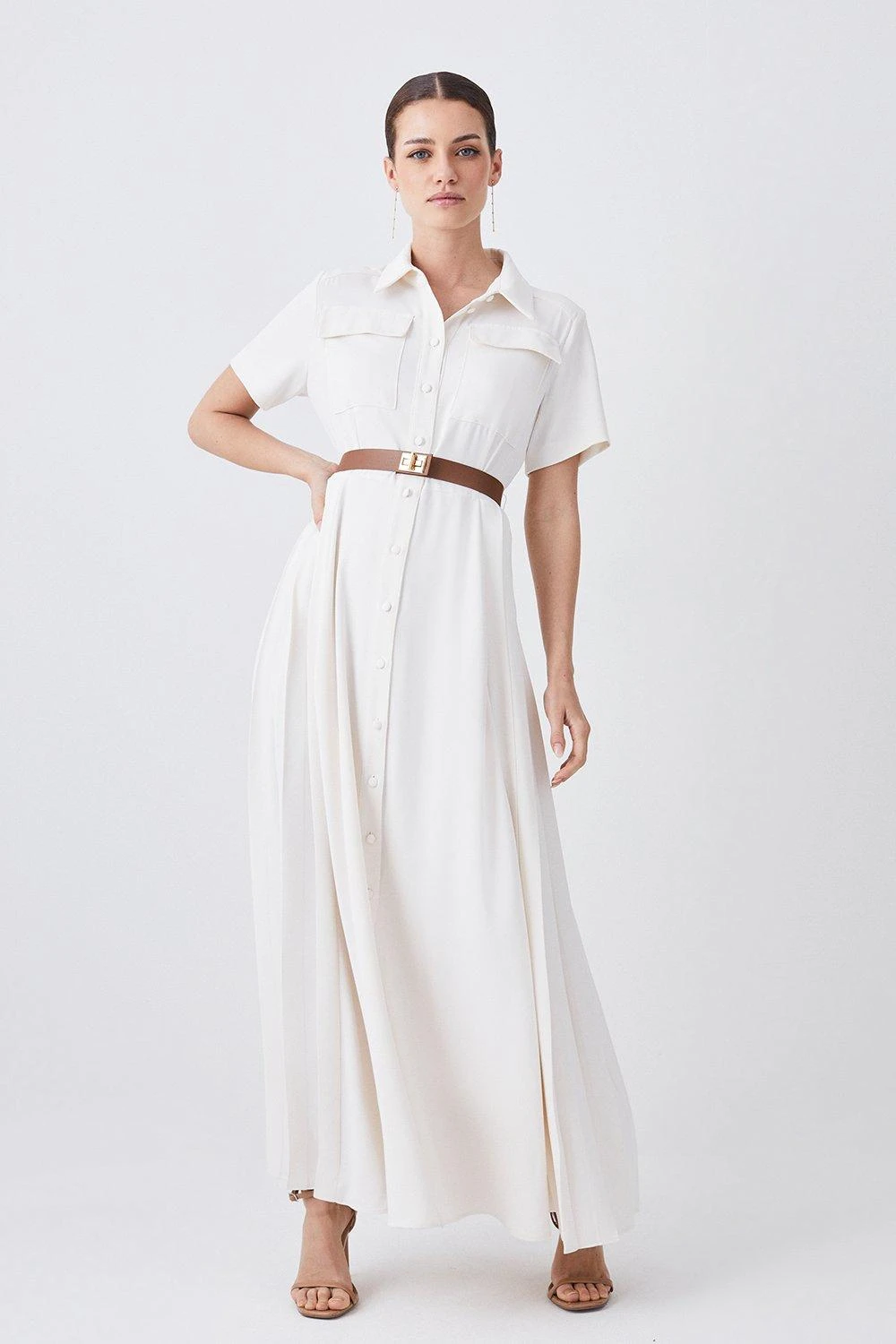 Master effortless sophistication in this flowing shirt dress. Crafted with a soft tailored fabrication, this piece boasts warm-weather appeal. A collared neckline, pleated skirt and flap pockets add a classic finish. Style this piece with sandals and a belt for an elegant everyday summer ensemble.