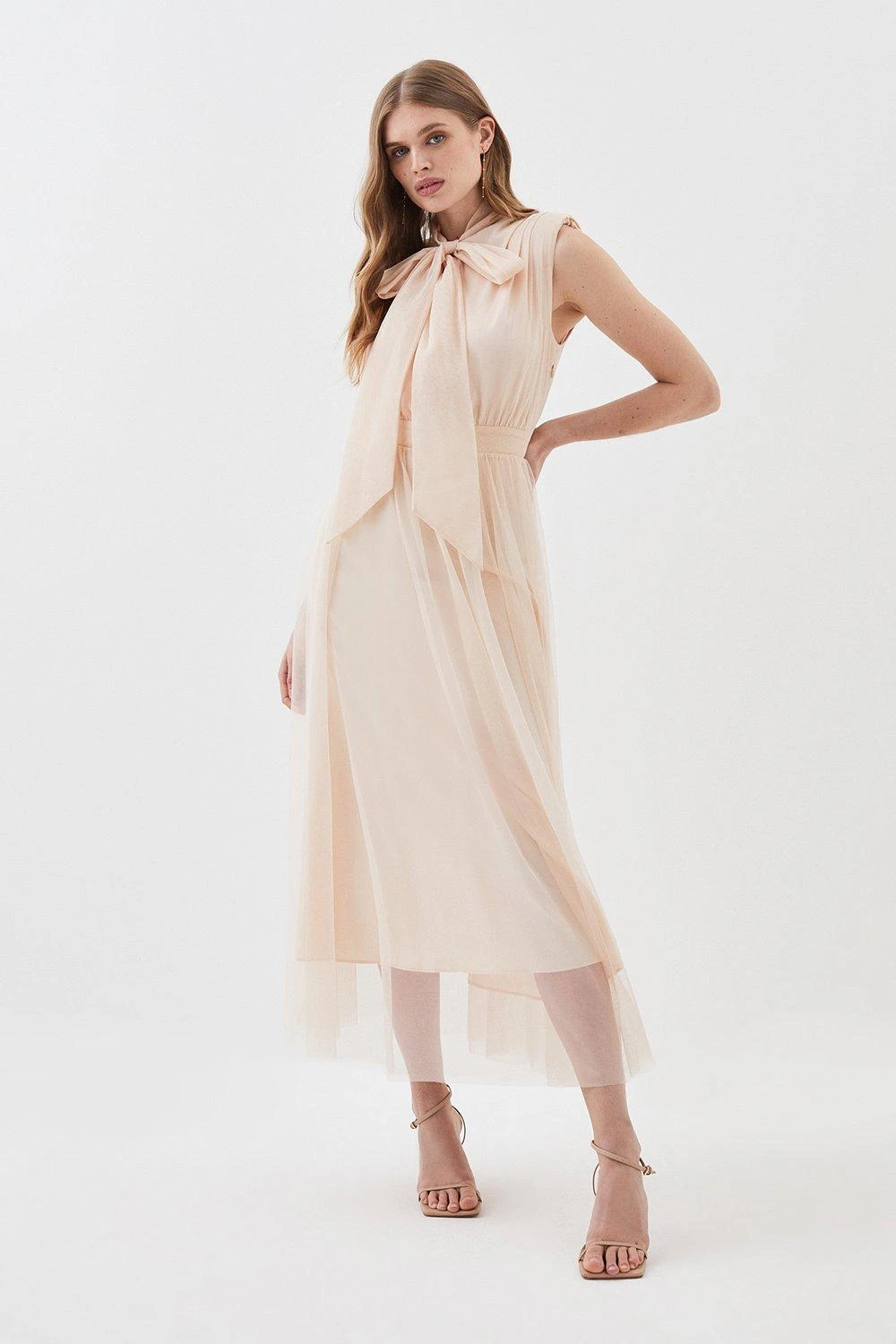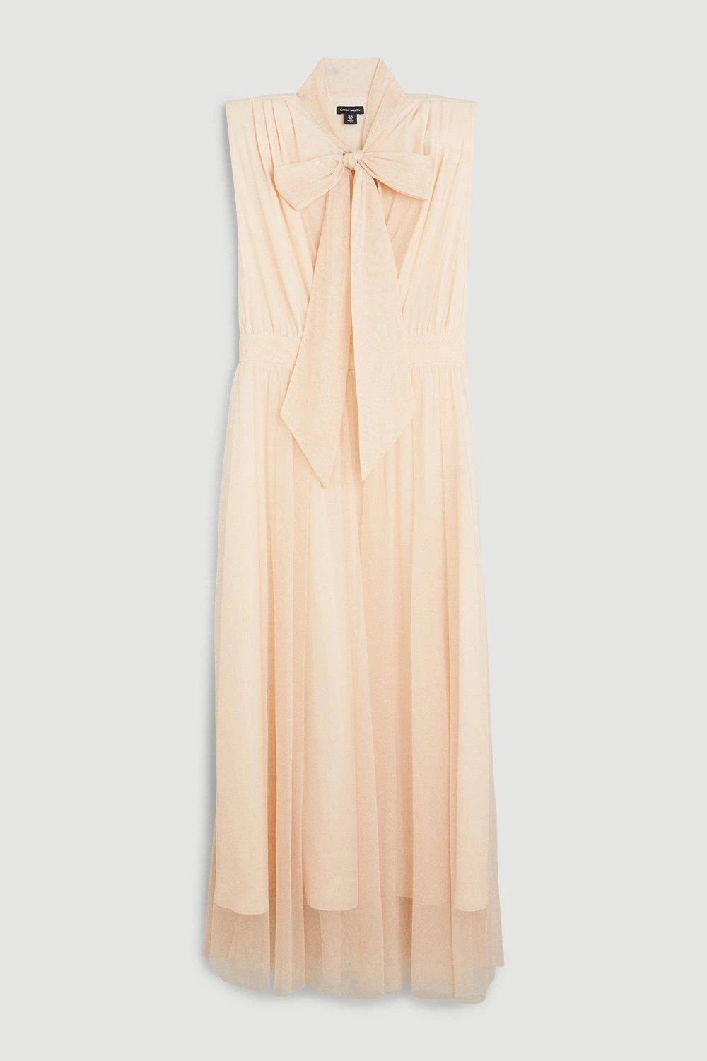 Exude understated elegance in this flowing maxi dress. Boasting a fluid silhouette, this piece is detailed with a classic front pussybow and mesh overlay, which embodies an ethereal mood. Style this piece with heels and accessories to curate an enviable wedding guest ensemble.