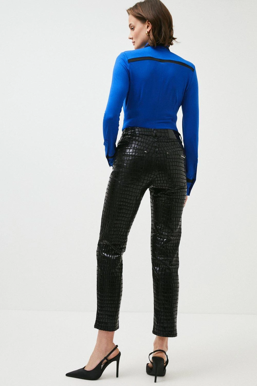 Exude confident flair and an ’80s punk rock influence with these straight leg jeans. Sitting slightly cropped on the leg, the textured croc effect has a patent shine. Slightly higher on the waist, they featured side and back pockets, as well as belt loops. Style it with a simple blouse, or alongside a T-shirt and leather jacket as a more casual alternative.