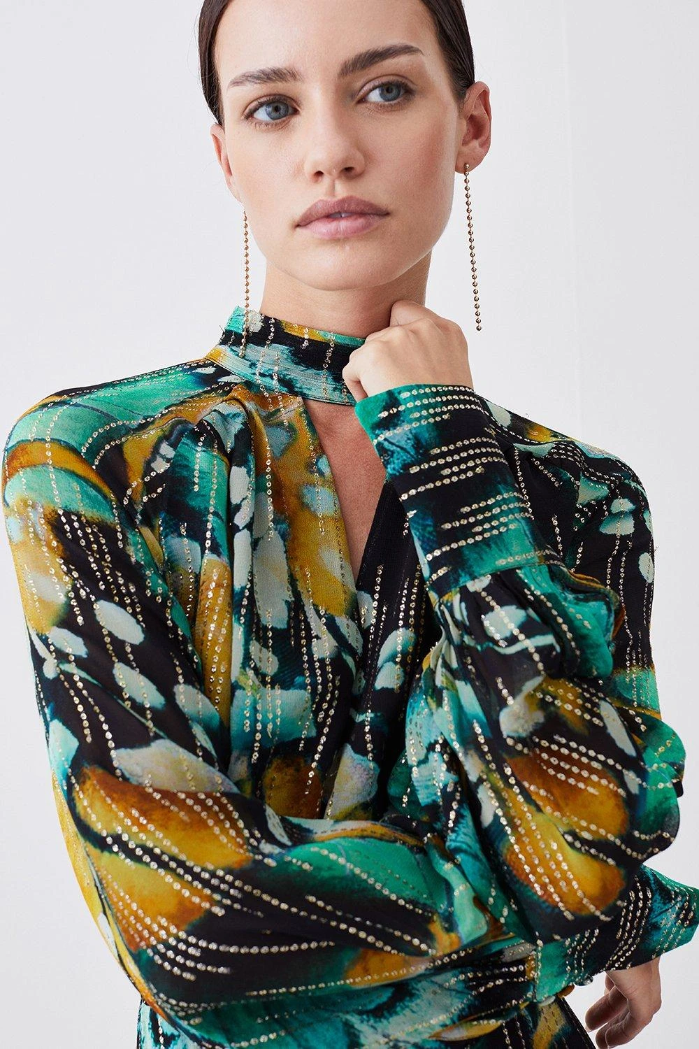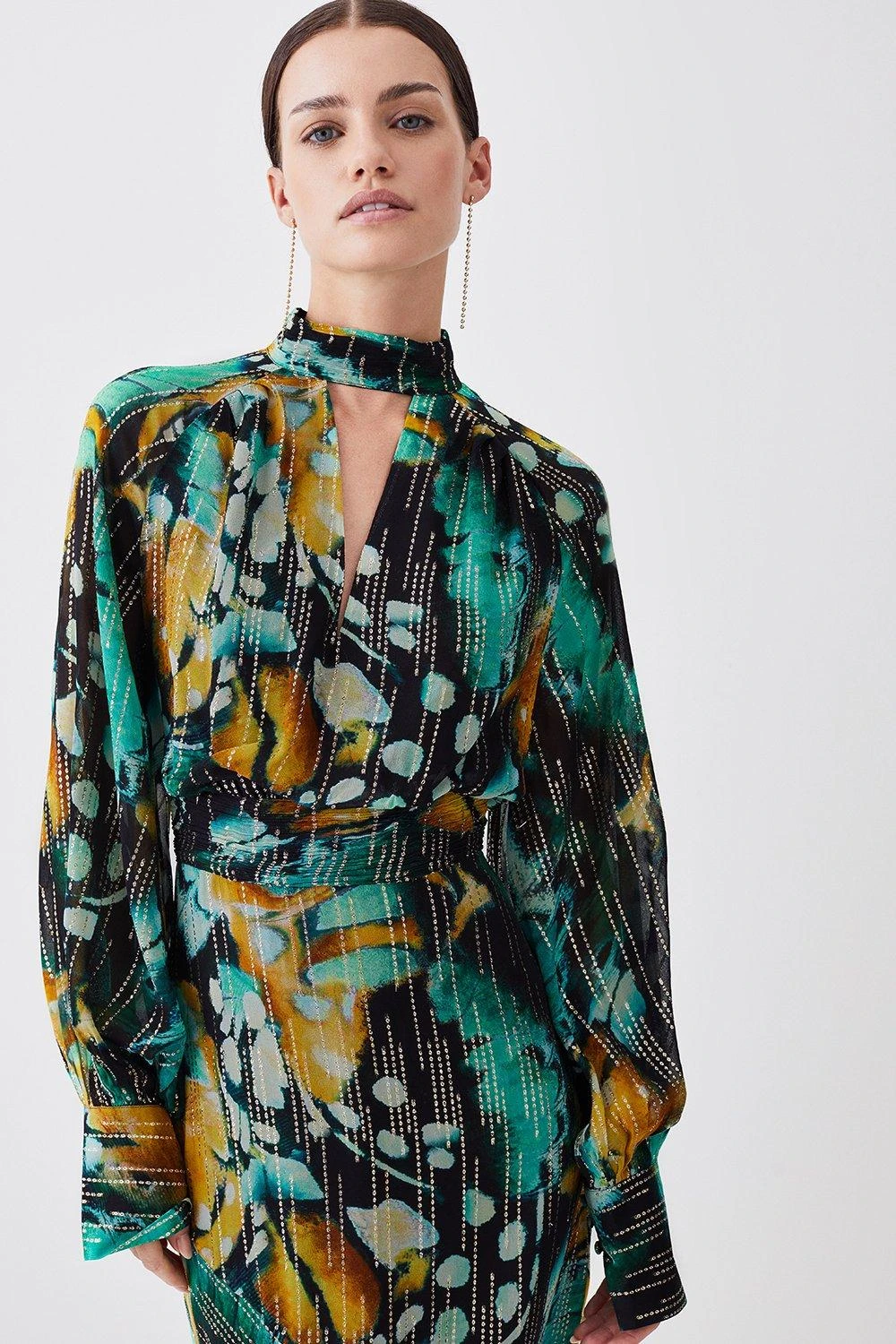 Designed with iridescent metallic detailing, this column midi dress exudes a sense romantic allure. This classic silhouette is enriched with a vibrant floral print, while a tiered hemline and balloon sleeves add an elegant touch. A fabric belt subtly cinches the waist of this fluid piece.