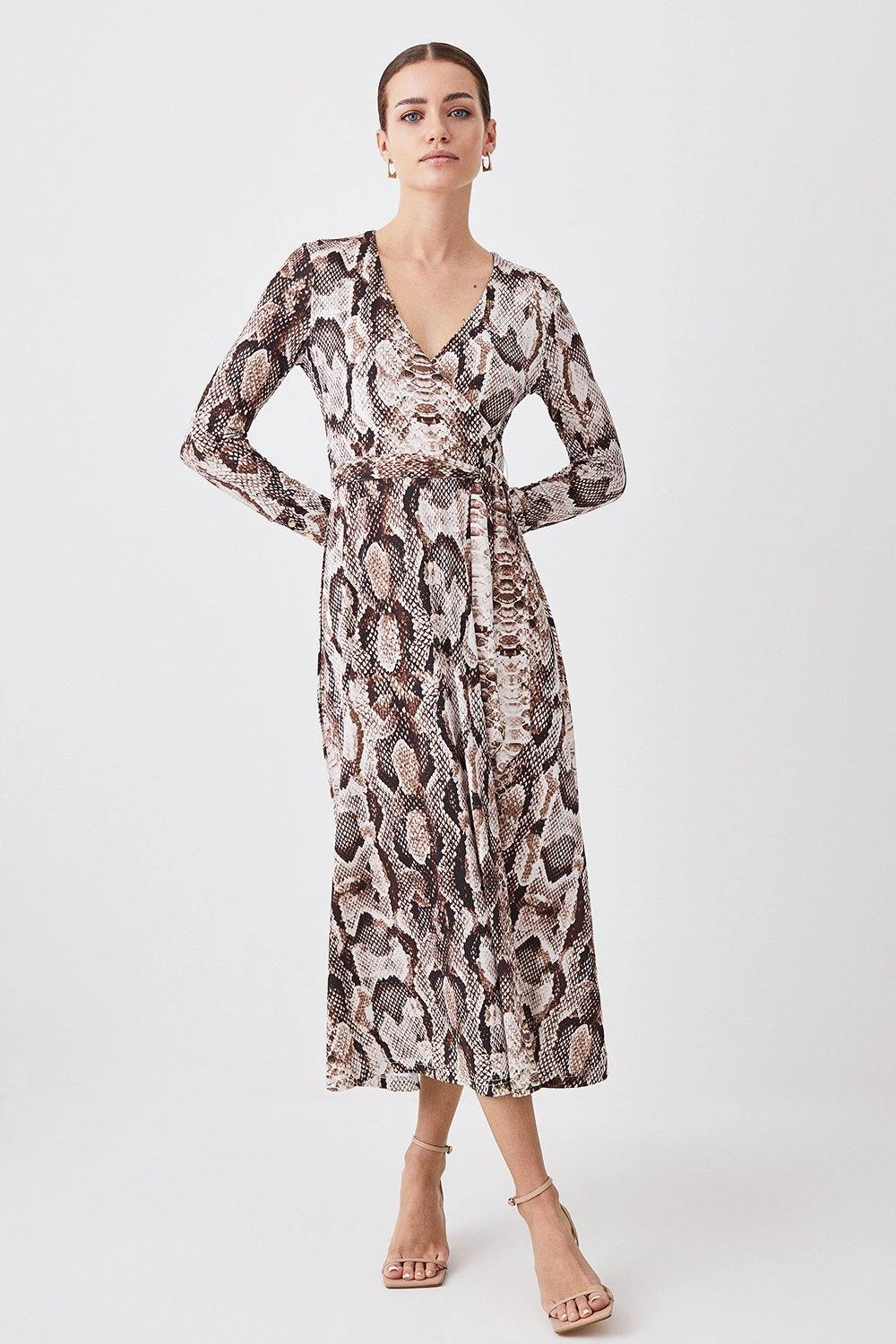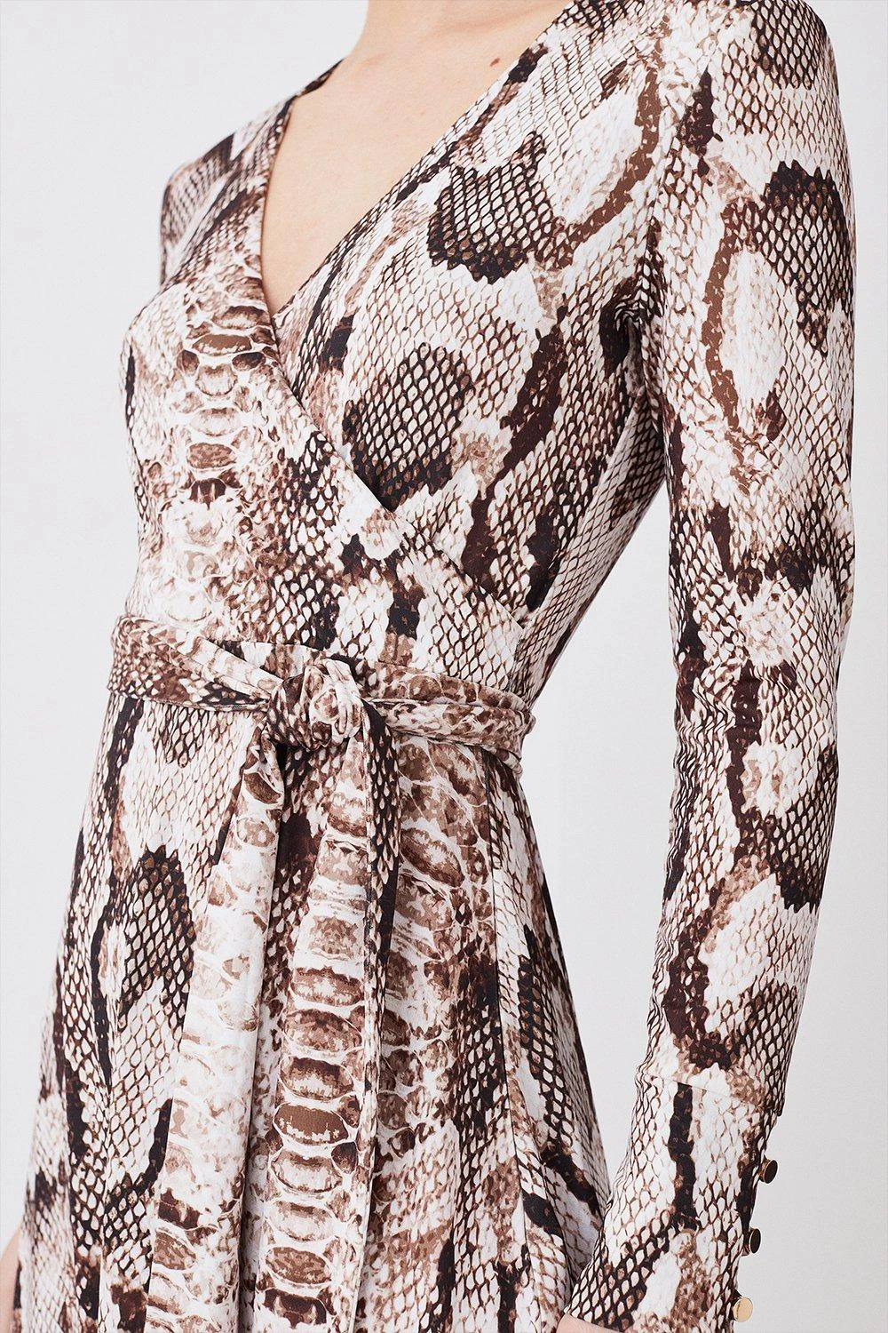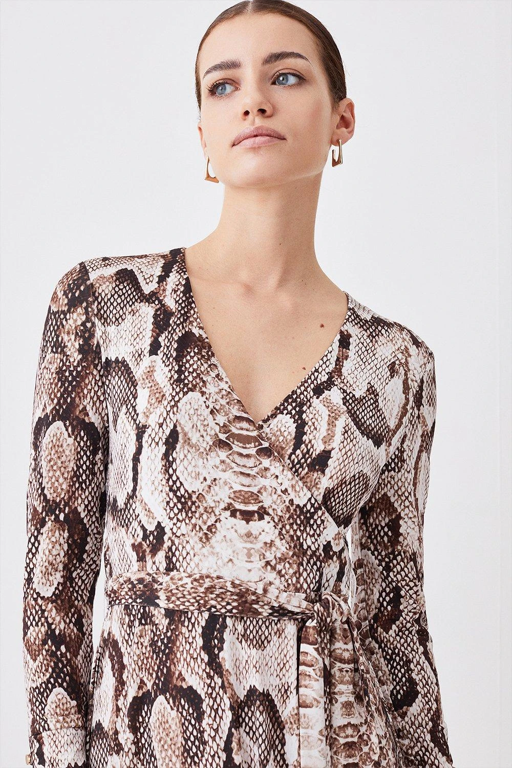 Detailed with an intricate snakeskin print, this jersey midi dress makes a bold-yet-versatile addition to new season wardrobes. A wrap design naturally flatters the form, while a flowing skirt crafted from jersey material sways elegantly with every step.