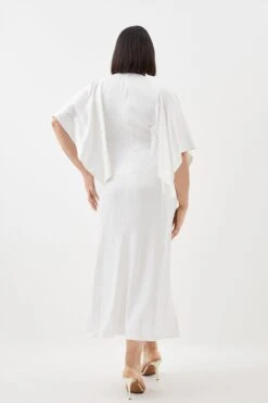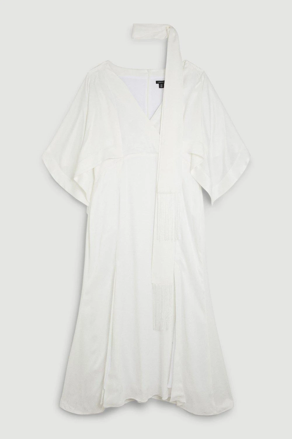 Crafted with signature satin crepe fabric, this flowing dress exudes a luxurious aesthetic. Boasting a fluid silhouette and dramatic batwing sleeves, this ethereal piece is universally flattering. An added scarf tie detail allows for customisation.
