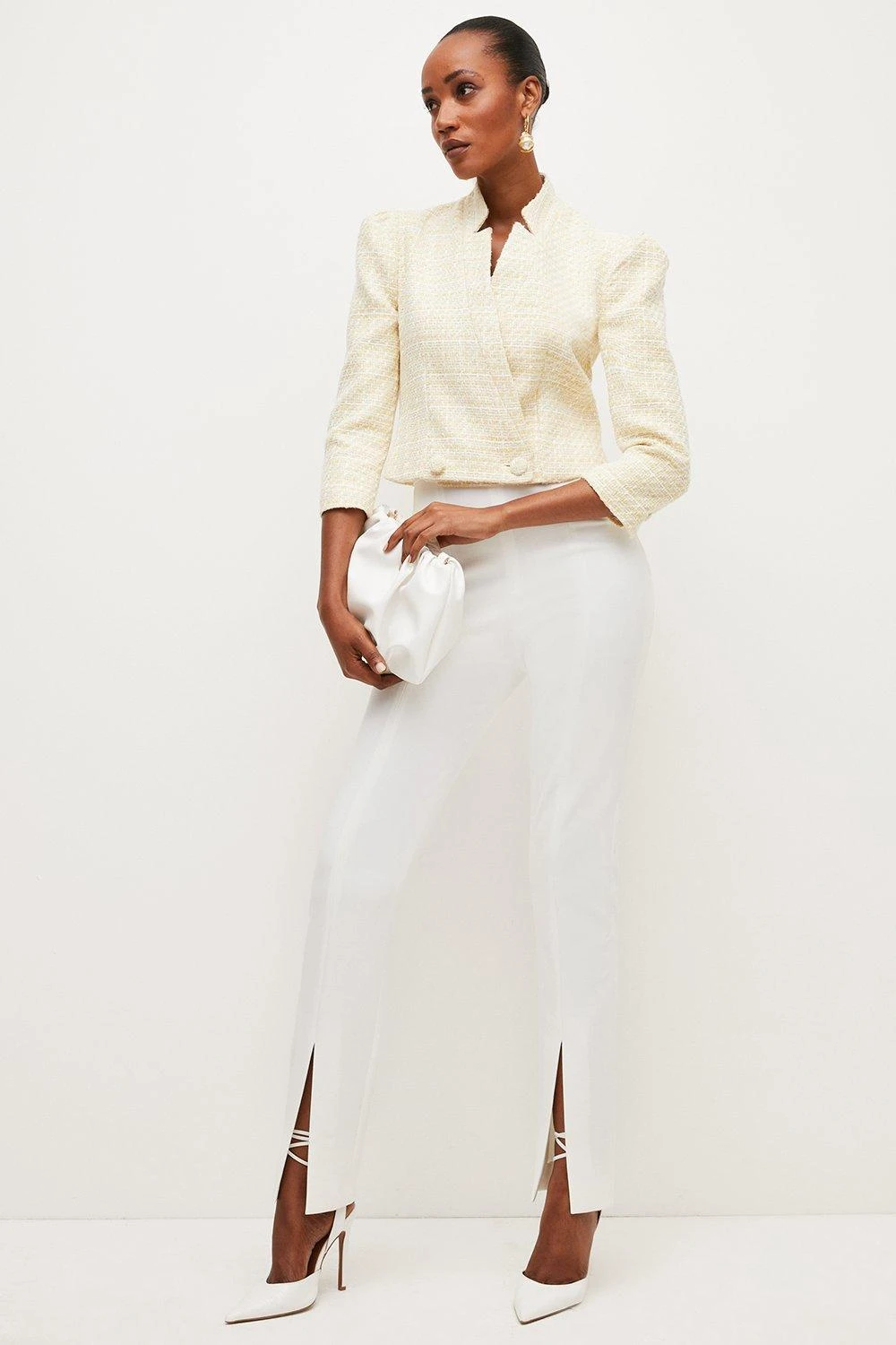 Perfectly proportioned to land at the slimmest part of your waist, this cropped tweed design is both flattering and functional. It features a unique notched neckline and gently puffed shoulders to further enhance your figure, fastening with fabric-covered tweed buttons cut in a classic double-breasted design.