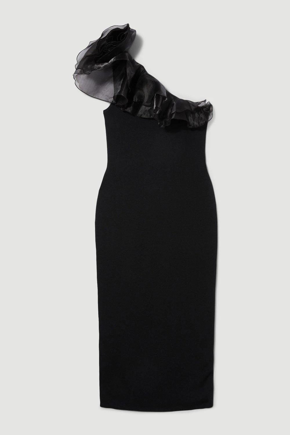 Adding a playful touch to partywear, this knit midi dress is defined by a statement organza floral motif and ruffle details. The knit material subtly sculpts the form, without feeling restrictive. An asymmetric neckline adds a contemporary update.