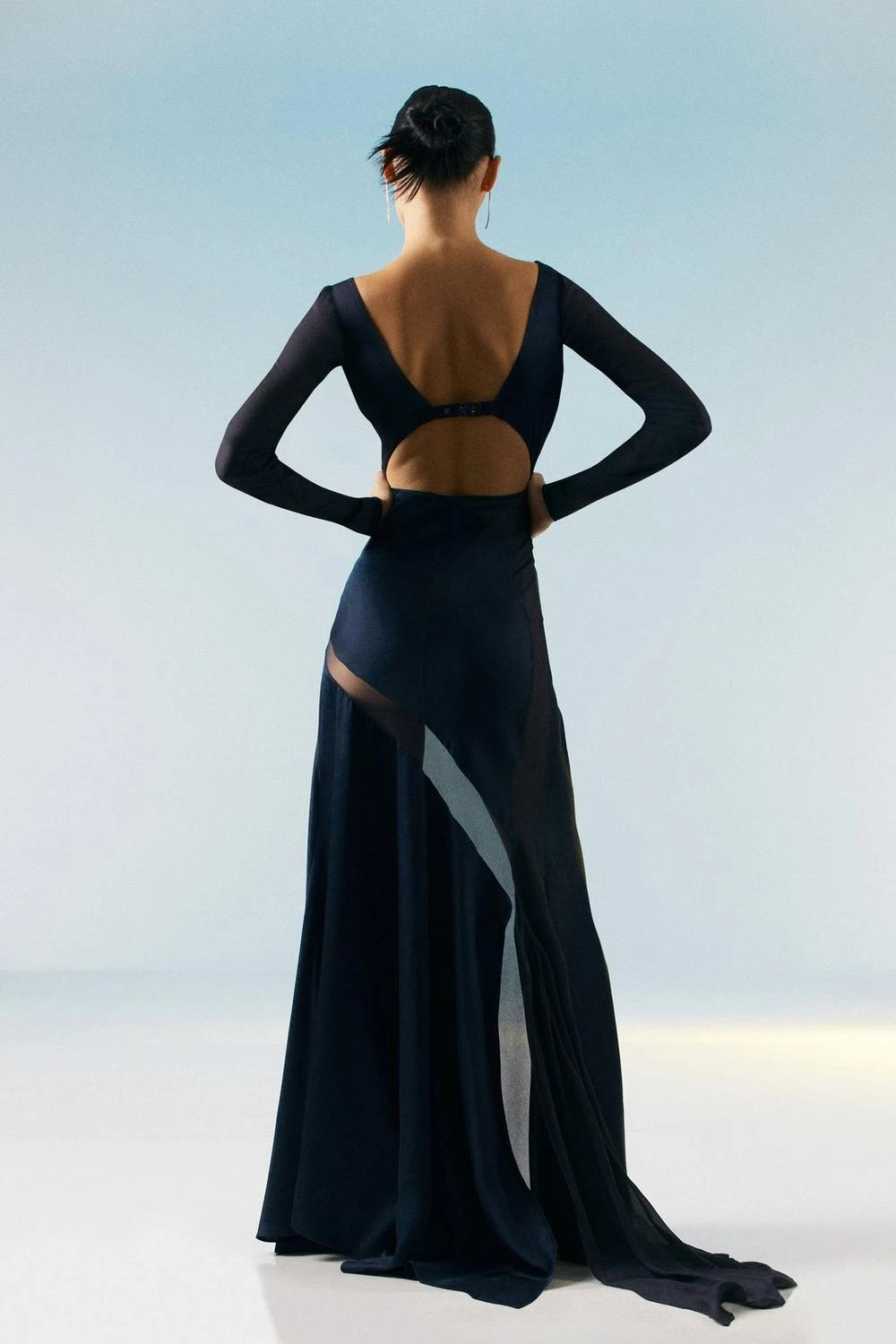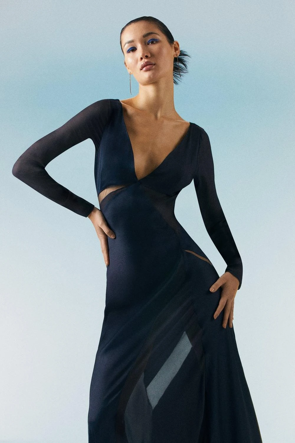 Emerging as a vision of both elegance and sensuality, this dress showcases endless appeal. An asymmetric mesh panel nods to a fashion-forward aesthetic, while silky material enhances the form to create a fluid silhouette.