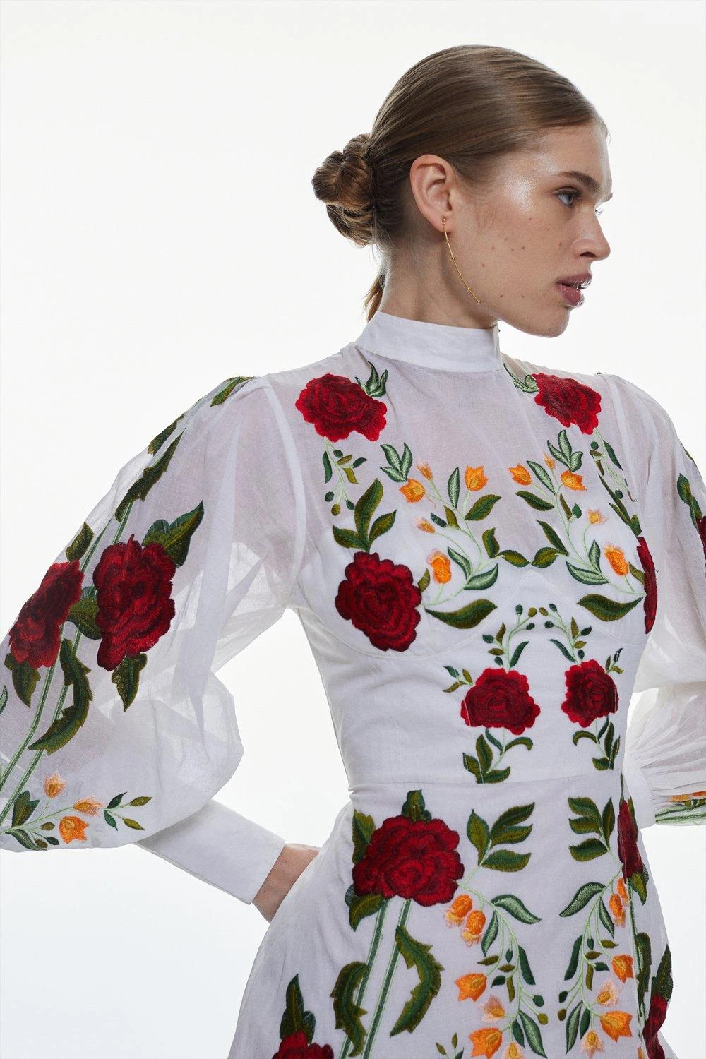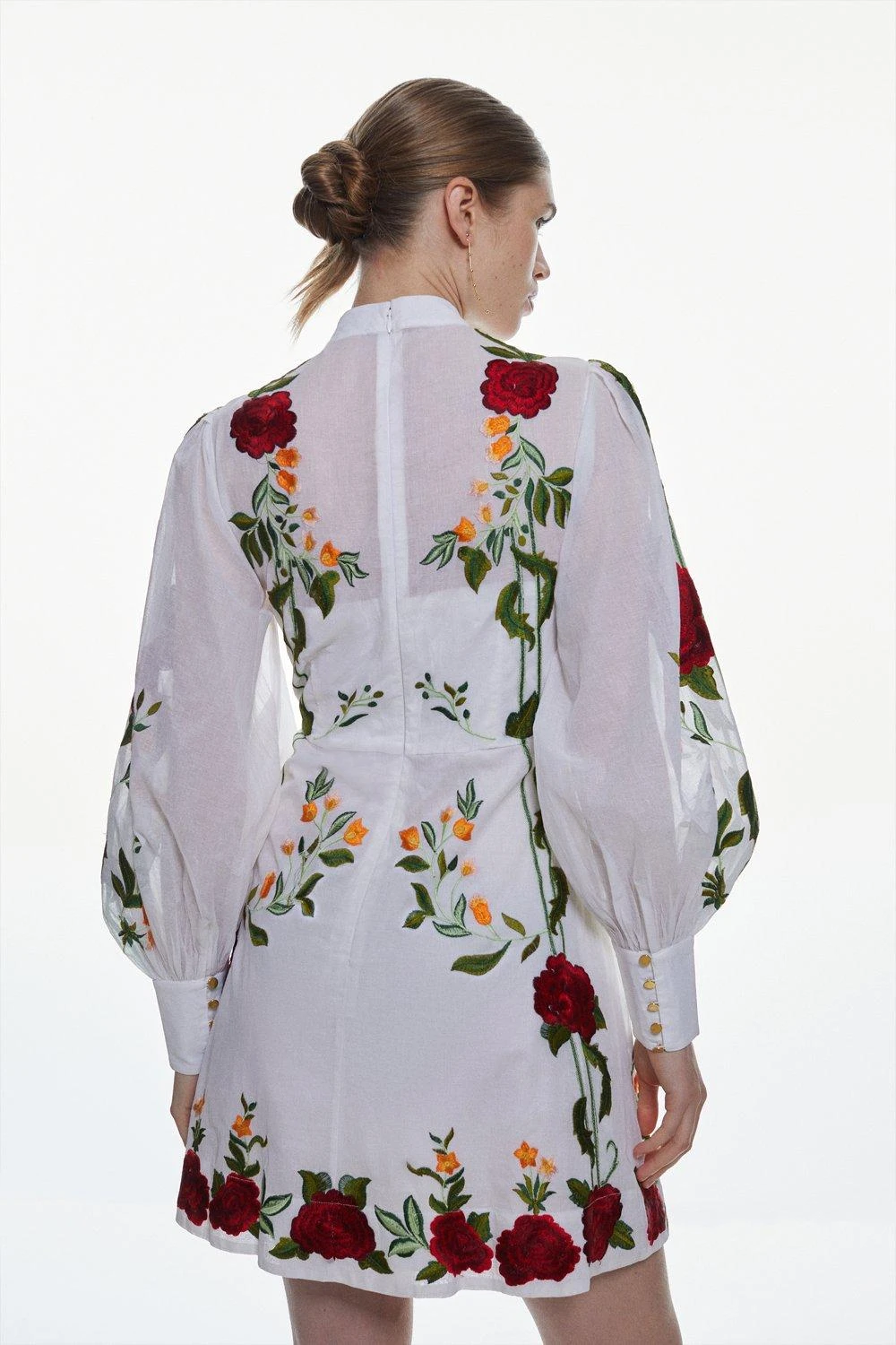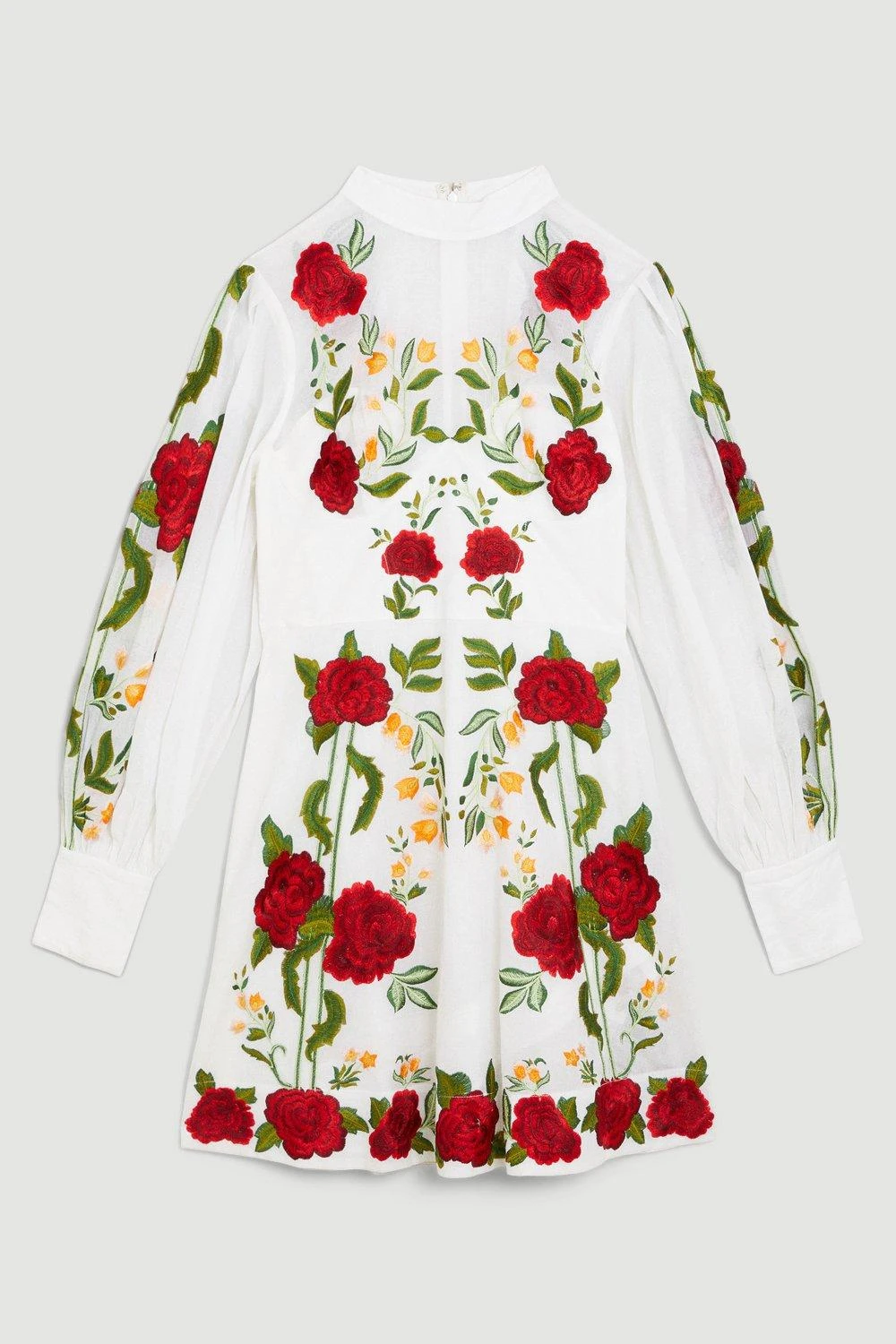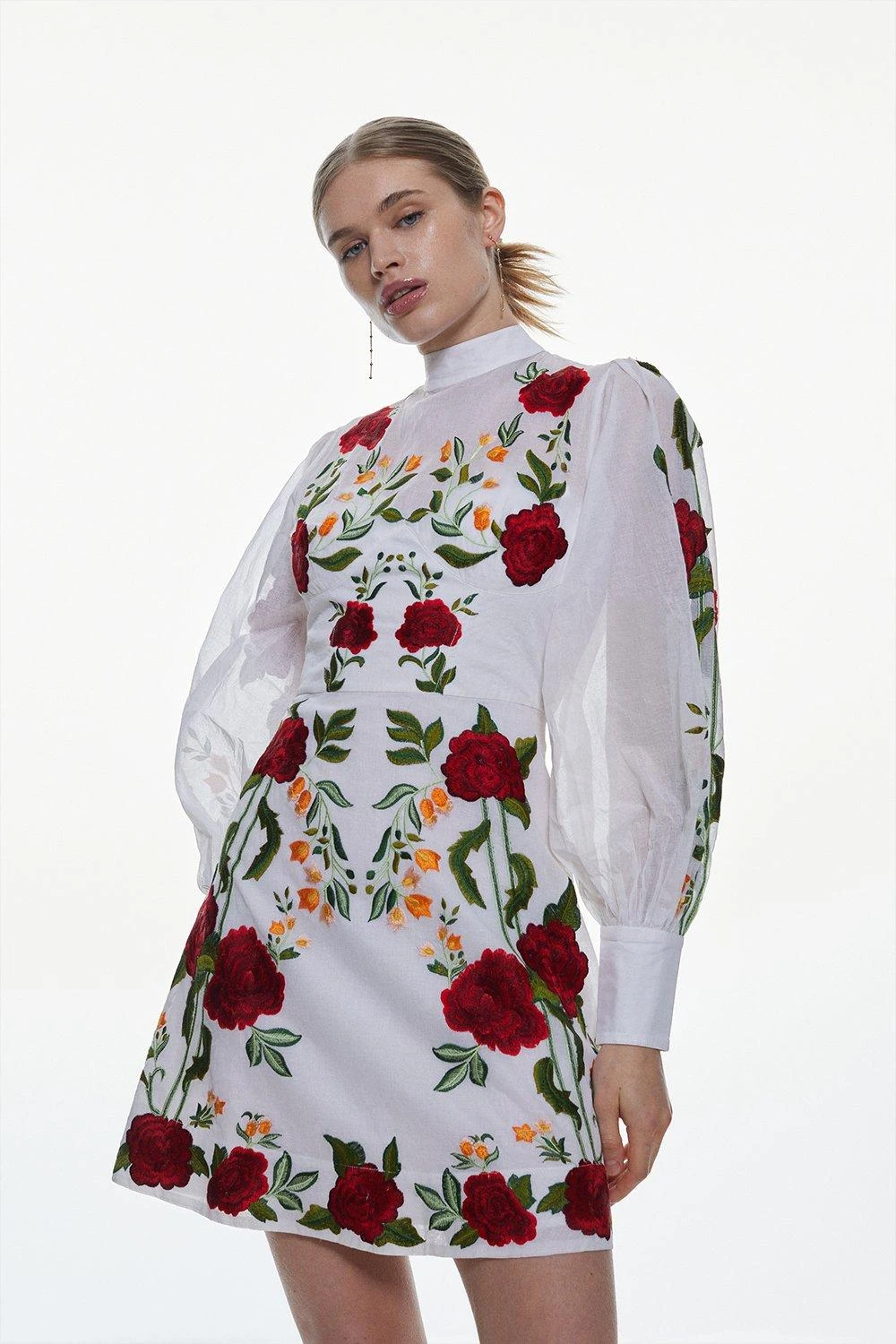 The epitome of summer romance, this cotton mini dress makes a unique addition to warm-weather collections. Embroidered rose details add timeless, Mediterranean essence to the piece, while balloon sleeves and a high neckline exude undeniable elegance