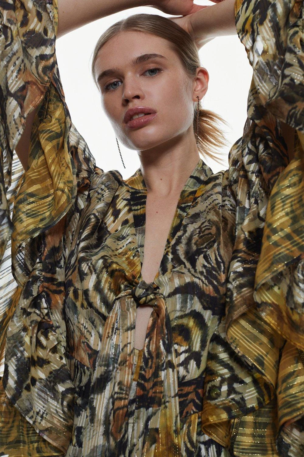 100% polyester. Gentle machine wash at 30 with similar colours. Model wears a UK 8/US Size 6.
